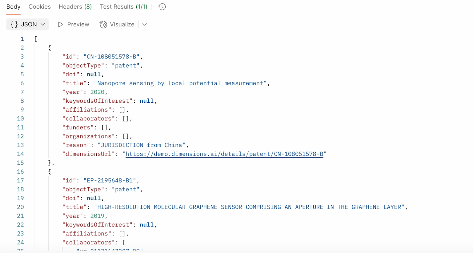 Receive clean JSON outputs for publications, grants, patents, and trials — each with attribution and metadata for streamlined review.