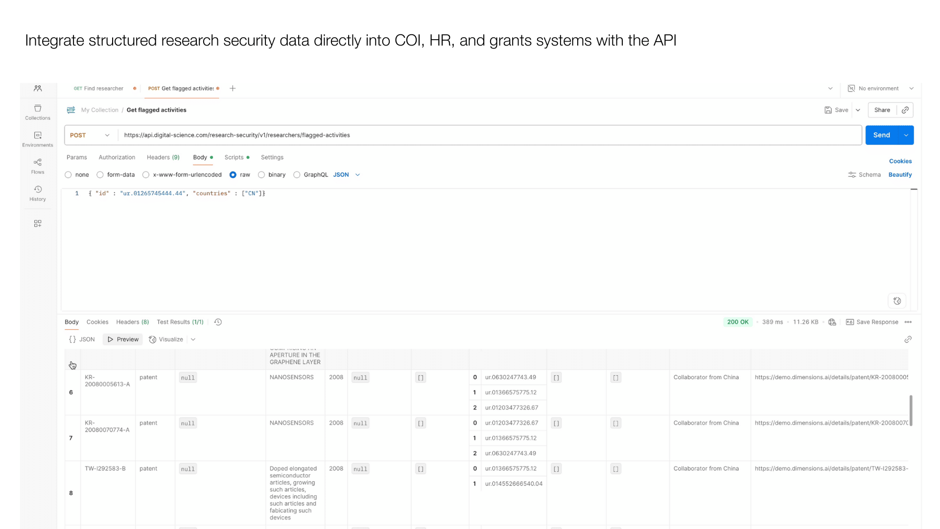 The Dimensions Research Security API extends this capability with system-to-system delivery of affiliations, collaborations, and flagged risks—built for direct integration into compliance, case management, and research administration systems.